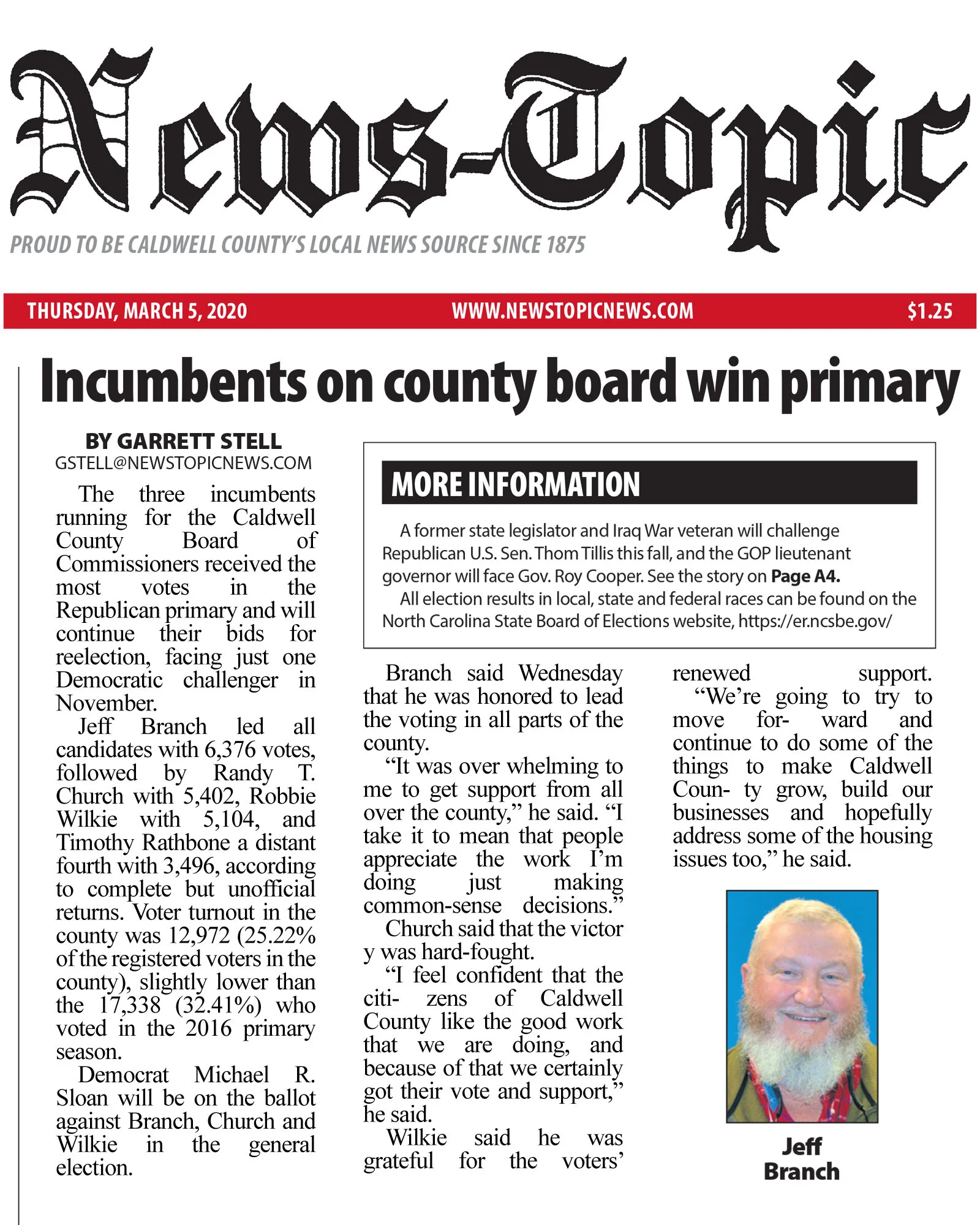 JEFF BRANCHCaldwell County Commissioner Caldwell CountyBoard of Commissioners - watch the latestmeetings WATCH Schedule Agendas Minutes Lenoir News-Topic’s coverage of the 2020 Election